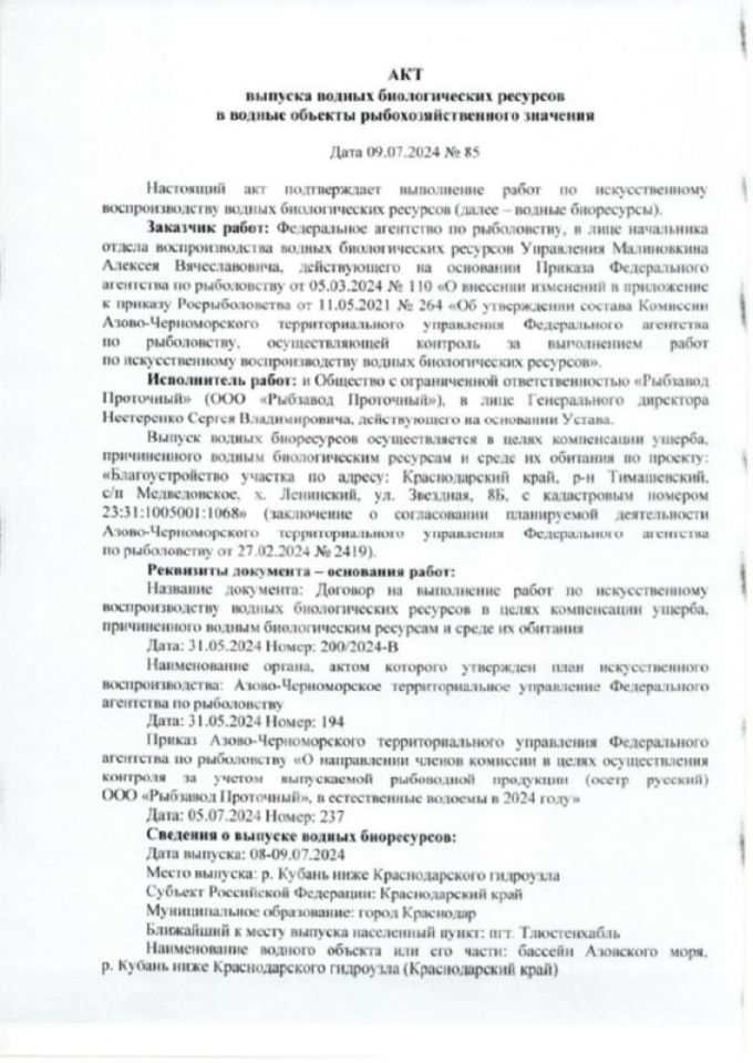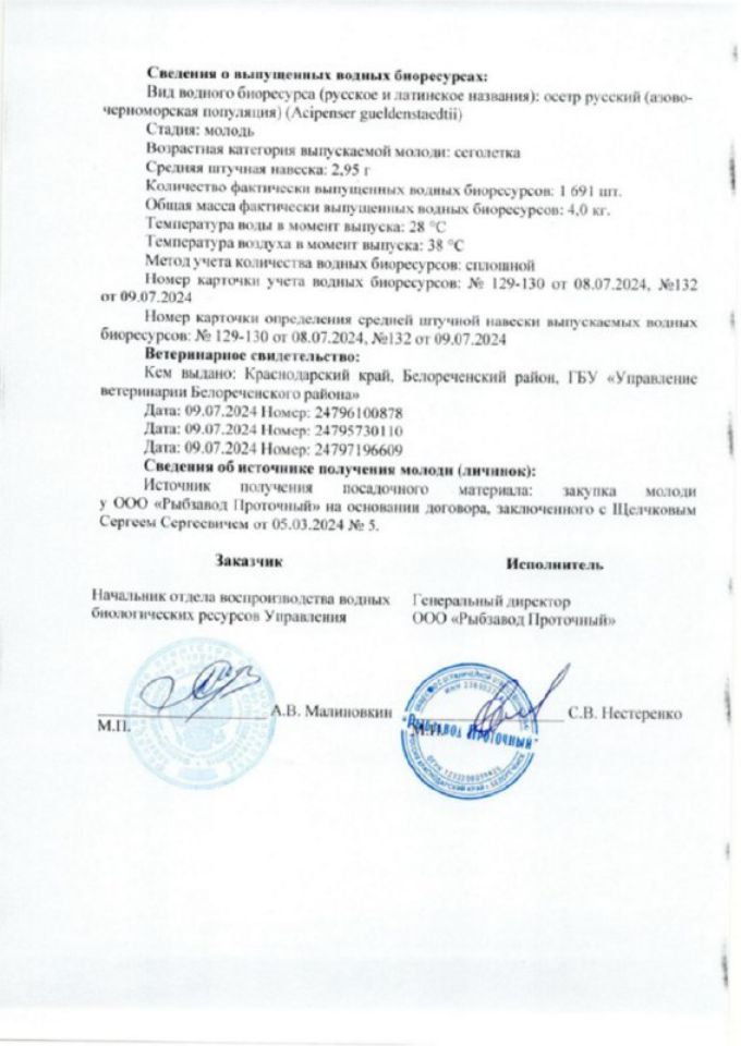 Заказчик вправе присутствовать при выпуске оплаченной им молоди. После выпуска молоди рыб (координаты места выпуска и время будут на сайте), сотрудниками Росрыболовства составляется Акт выпуска водных биологических ресурсов в водный объект рыбохозяйственного значения, оформленный в соответствии с приказом Минсельхоза России от 2 сентября 2019 года № 518 и составленный представителями Федерального агентства по рыболовству, который является подтверждением исполнения Исполнителем своих обязательств и публикуется на информационных ресурсах Исполнителя.